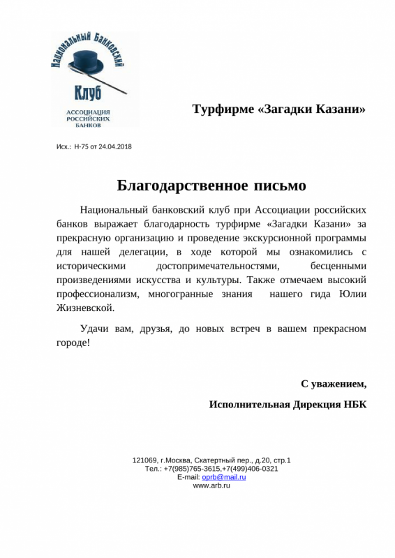 Национальный банковский клуб при Ассоциации российских банков выражает благодарность турфирме «Загадки Казани» за прекрасную организацию и проведение экскурсионной программы для нашей делегации, в ходе которой мы ознакомились с историческими достопримечательностями, бесценными произведениями искусства и культуры. Также отмечаем высокий профессионализм, многогранные знания нашего гида Юлии Жизневской. Удачи вам, друзья, до новых встреч в вашем прекрасном городе!